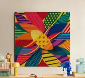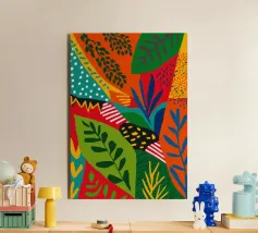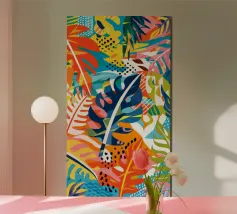 Un'opera d'arte astratta ricca e complessa intreccia vari motivi colorati, texture e forme, creando un arazzo artistico e visivamente stimolante di elementi di design.