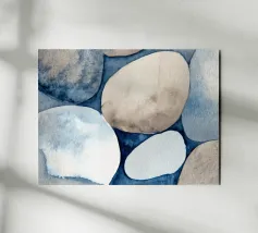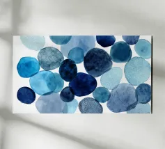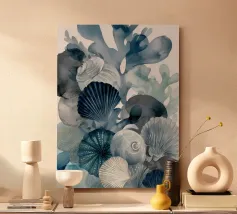 Una composizione serena di forme astratte di conchiglie e coralli dipinte con lavaggi indaco stratificati. Questo pezzo cattura il ritmo organico e la ripetizione delle texture del mare, perfetto per aggiungere una calma e moderna atmosfera costiera a qualsiasi spazio. Ideale per case al mare, bagni o interni minimalisti con un tocco nautico.