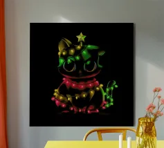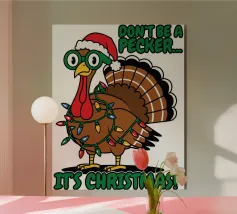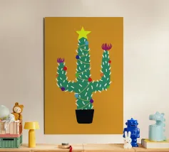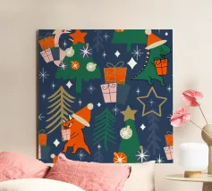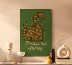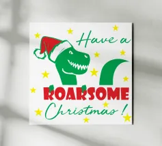 Un allegro dinosauro verde è decorato in modo spiritoso per assomigliare a un albero di Natale, con tanto di luci colorate e stella sulla testa. Le parole "Tree Rex" sono scritte in modo scherzoso accanto ad esso, per rendere ancora più festoso il tema.