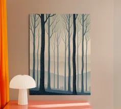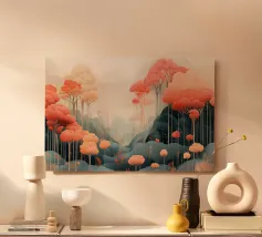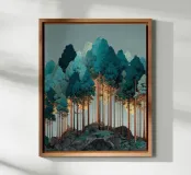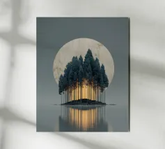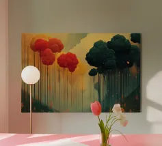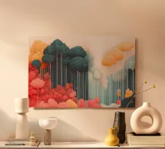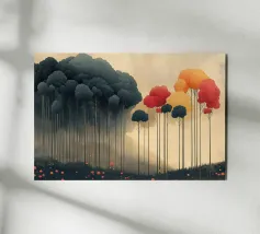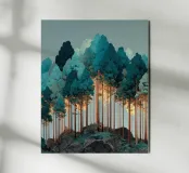 Un paesaggio da sogno dove colore, luce e forma si fondono in una tranquilla armonia. Sottili tronchi d'albero si ergono da uno sperone roccioso, sostenendo una fitta chioma dai toni delicatamente cangianti che brillano dall'interno. La luce che filtra attraverso la foresta crea un senso di calore e di elevazione, trasformando la scena in qualcosa di naturale e ultraterreno.