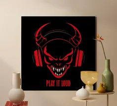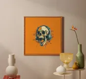 Illustrazione digitale dettagliata di un teschio umano che indossa grandi cuffie, su uno sfondo arancione vivo con effetti splatter. Il teschio sembra apprezzare la musica, aggiungendo un'atmosfera moderna e tagliente al design.