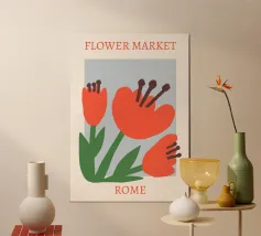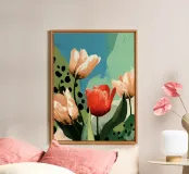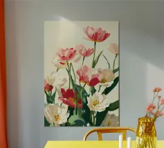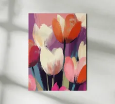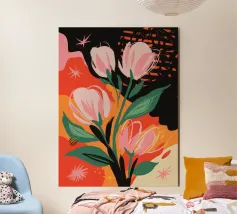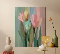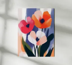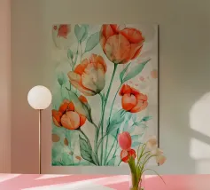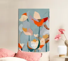Una composizione floreale espressiva in cui colore ed emozione si dispiegano insieme. Morbidi fiori color pesca e rosso intenso si stagliano su sfondi verdi e tonalità celesti, catturando la sensazione di qualcosa che sta delicatamente iniziando. Quest'opera d'arte riflette l'amore, la speranza e la connessione nella loro forma più primitiva, ideale per interni che abbracciano calore, ottimismo e profondità emotiva.