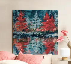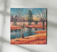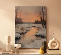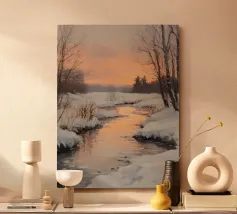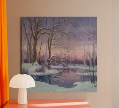 Alberi spogli e cielo rosa si riflettono dolcemente in uno stagno invernale in fase di disgelo, evocando una serena e fredda bellezza.