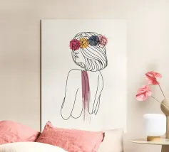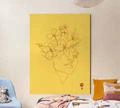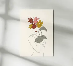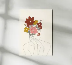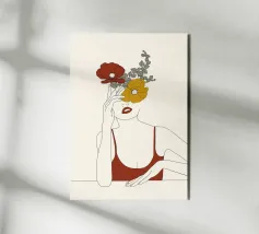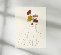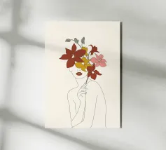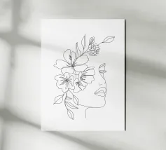 Un disegno al tratto minimalista raffigura il profilo di una donna dall'espressione serena. I suoi capelli sono ornati da grandi fiori stilizzati di colore arancione e giallo e da foglie delicate.