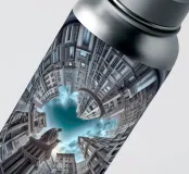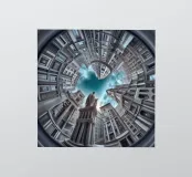 Questa immagine raffigura un'impressionante disposizione architettonica circolare con alti edifici classici modernizzati che convergono verso il cielo. Una statua prominente al centro esalta la prospettiva drammatica sotto un cielo azzurro e nuvoloso.