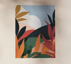 A modern abstract composition of various stylized botanical shapes and leaves in a palette of terracotta, beige, and dark blue against a light background.