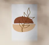 Una composizione astratta presenta un semplice sfondo geometrico marrone e beige con un delicato disegno al tratto di un ramoscello frondoso. Il design minimalista enfatizza gli elementi naturali in un equilibrio armonioso.