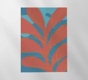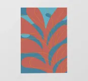 Disegno astratto caratterizzato da grandi forme curvilinee rosse sovrapposte a uno sfondo blu, intersecate da linee gialle sottili e fluide. La composizione crea un senso di movimento e di modelli organici.
