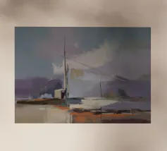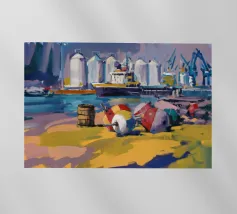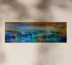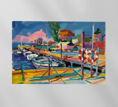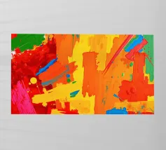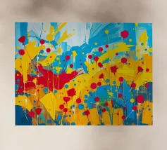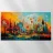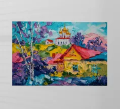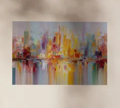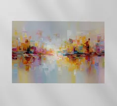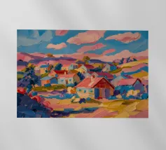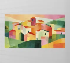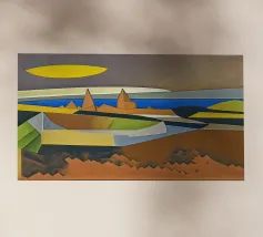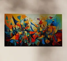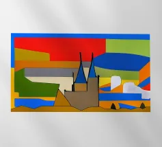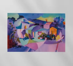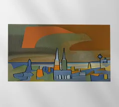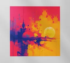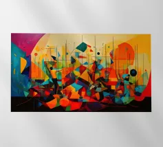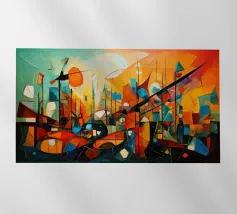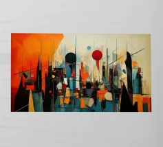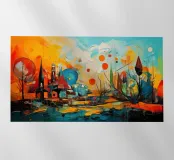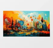 Quadro astratto dinamico che presenta un'architettura surreale, vivaci toni arancioni e blu, alberi astratti e sfere fluttuanti in un paesaggio fantastico. I tratti strutturati e i contrasti decisi creano un'atmosfera onirica ed energica.