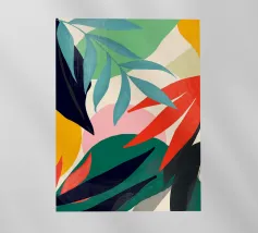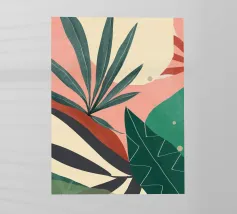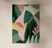 An elegant abstract artwork features overlapping leaves and organic shapes in a sophisticated palette of green, pink, and white, creating a modern and graceful botanical composition.