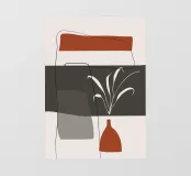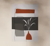 Linee astratte e blocchi di colori tenui creano una composizione moderna dall'estetica minimalista. La forma stilizzata di una pianta e quella semplice di un vaso aggiungono elementi organici, in contrasto con le forme geometriche.