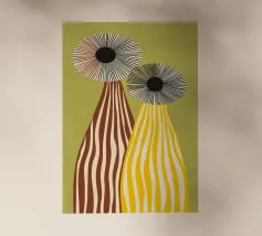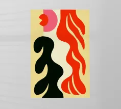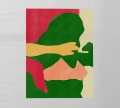Illustrazione astratta di due figure stilizzate che indossano abiti rossi e verdi dai motivi vivaci, con forme semplificate ed eleganti.