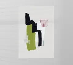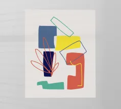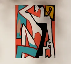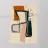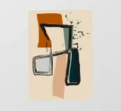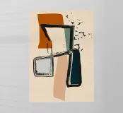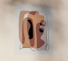 Forme astratte e pennellate decise nei toni della terra si combinano con uno sfondo chiaro. La composizione presenta rettangoli sovrapposti e schizzi a forma libera, creando un look dinamico e moderno.