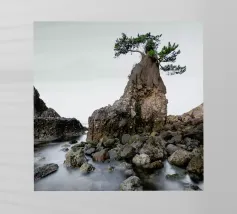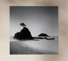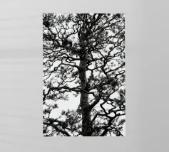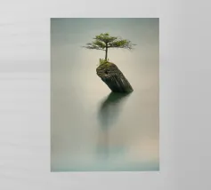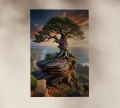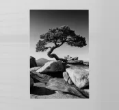 Fotografia di paesaggio, questa suggestiva opera d'arte in bianco e nero presenta un albero resistente in cima a una montagna.