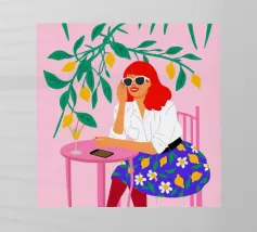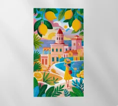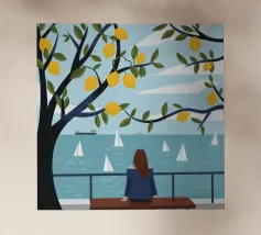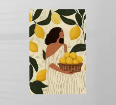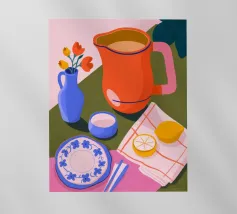 Questa opera d'arte presenta una tavola imbandita con una brocca, un vaso con fiori, un piatto con una fetta di limone e una tazza. Lo sfondo è costituito da una parete rosa e da una tovaglia verde, che creano un ambiente allegro e invitante per la colazione.
