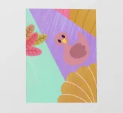 L'allegra illustrazione presenta un tacchino a fumetti in tenui colori pastello, circondato da elementi autunnali.