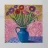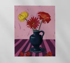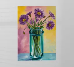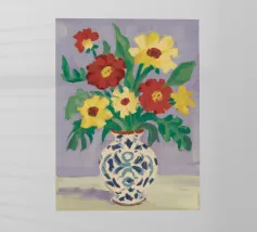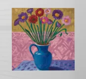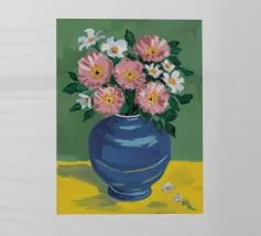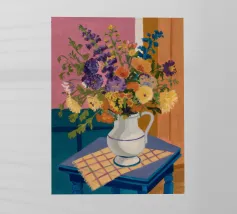 Una vivace serie di fiori di campo colorati disposti in un vaso blu. Lo sfondo è di un rosa strutturato e modellato, creando una composizione ricca e gioiosa, piena di vita e di colore.