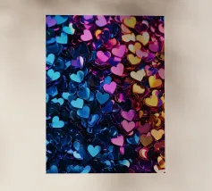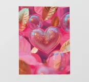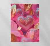 Stampa d'arte Cuore rosa con accenti oro e glitter - Quest'opera d'arte di grande impatto visivo presenta un cuore rosa scintillante su una superficie simile al vetro, circondato da foglie d'oro e bolle traslucide. I colori vivaci del rosa e dell'oro, combinati con una luce soffusa, creano un'atmosfera romantica e sognante. I dettagli intricati e le texture riflettenti dell'opera d'arte la rendono un regalo perfetto per gli amanti dell'arredamento moderno e stravagante e dell'arte romantica.