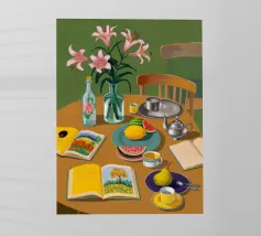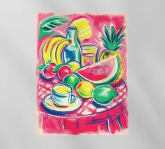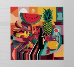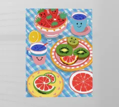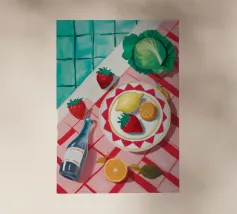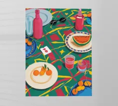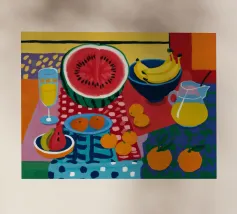 A still life featuring a slice of watermelon, a cup of juice, and a stack of books on a colorful, patterned tablecloth. The composition is a fresh, intellectual, and stylish depiction of summer reading and treats.