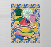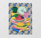 Una natura morta con una fetta di anguria, una tazza di succo di frutta e una pila di libri su una tovaglia colorata e a fantasia. La composizione è una rappresentazione fresca, intellettuale ed elegante della lettura e dei piaceri estivi.
