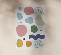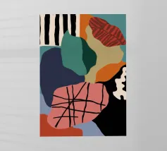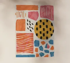 Una composizione astratta di forme assemblate con varie texture e motivi, tra cui griglie e punti. La sofisticata palette di colori e la disposizione equilibrata le conferiscono un'atmosfera da metà secolo moderno.