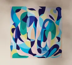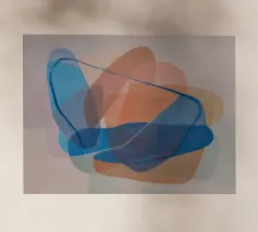 Un dipinto astratto dinamico, caratterizzato da forme fluide e sovrapposte in una suggestiva combinazione di blu, arancione caldo e beige neutro, che trasmette un'energia fluida.