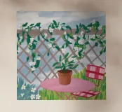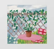 Una scena serena di un tavolino e una pianta in vaso su un balcone, con una vite rampicante su un traliccio sullo sfondo. I colori tenui e l'atmosfera tranquilla catturano un perfetto momento di pace da giardino urbano.