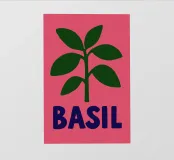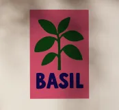 Un poster moderno di ispirazione pop art con il basilico come motivo grafico principale. Le foglie stilizzate di colore verde intenso spiccano sullo sfondo rosa acceso, completate dalla scritta "BASIL" in blu scuro. Questo design minimalista in stile Artezza gioca con i contrasti e i colori ed è perfetto come poster per la cucina, come decorazione per le piante o come elegante dichiarazione di erbe aromatiche per la vostra casa.