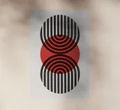 Un audace disegno astratto ispirato al Bauhaus, caratterizzato da cerchi rossi sovrapposti e ritmiche linee verticali nere. Un elemento d'arredo moderno e di grande impatto, perfetto per gli interni contemporanei.