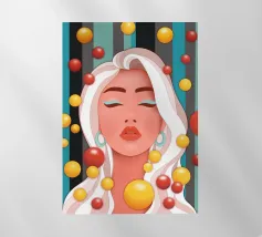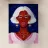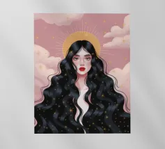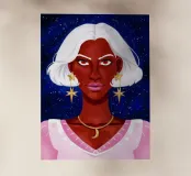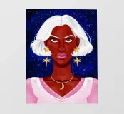 Quest'opera d'arte raffigura una figura dai capelli bianchi su uno sfondo stellato blu intenso. La figura è adornata da orecchini d'oro, che creano un'atmosfera celestiale e bellissima.