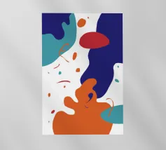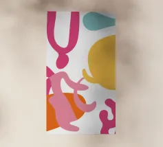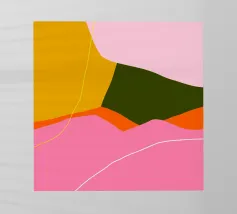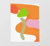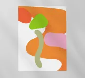 Forme audaci e astratte in arancione, rosa, verde e beige scorrono su uno sfondo bianco, creando una composizione dinamica e moderna. Il gioco di colori e forme suggerisce movimento ed equilibrio all'interno di un design minimalista.