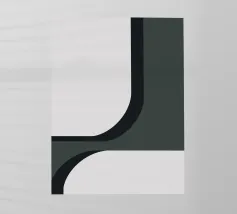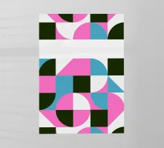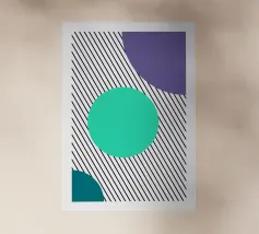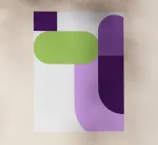 Forme geometriche in viola, lavanda e verde sono disposte in un design minimalista. La composizione crea un aspetto moderno e astratto con blocchi di colore audaci che si intersecano in vari angoli.