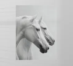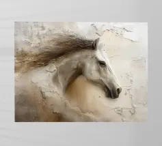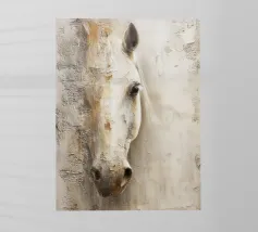 Un'immagine surreale che raffigura una figura umana con la testa di un cavallo, elegantemente avvolta in un tessuto beige strutturato. La composizione trasmette mistero, maestria e un senso di simbolismo ultraterreno, fondendo elementi umani e animali.