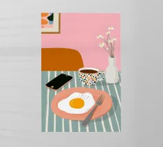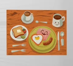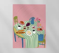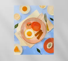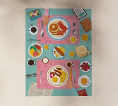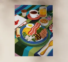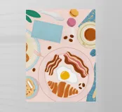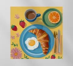 A top down view of a breakfast table with a croissant, bacon, eggs, coffee, and a letter. The style is modern, clean, and captures a perfect morning moment.