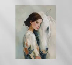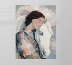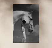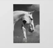 A black-and-white surreal image of a woman in a lace dress facing a giant horse head with cracked textures, creating a dreamlike, thought-provoking atmosphere against a cloudy sky.