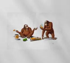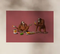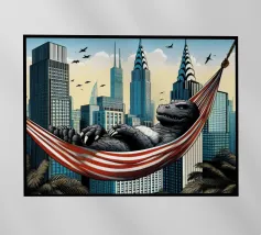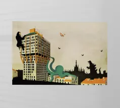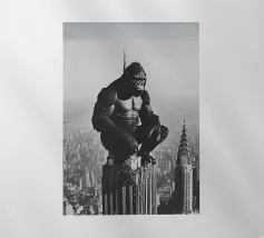 Illustrazione comica di una parodia classica della storia di King Kong. Lo scimmione costruisce l'Empire State Building con i lego, ma non sa cosa fare con Barbie.