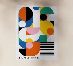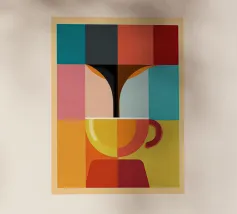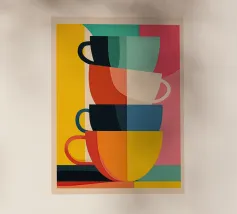 This poster combines bold typography with colorful, minimalist coffee cups. Perfect for coffee lovers and contemporary decor enthusiasts.