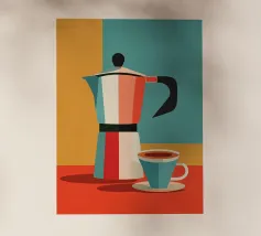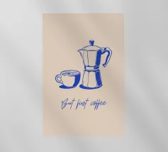 Illustrazione in bianco e nero con caffettiera, chicchi di caffè e scritta "Caffè? Design pulito con un tocco retrò, perfetto per gli amanti del caffè e per le pareti delle cucine moderne.