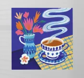 Illustrazione stravagante di una tazza di caffè fumante in una tazza a scacchi blu e bianchi, con fiori stilizzati che fluttuano sopra di essa, su uno sfondo blu scuro e ondulato.