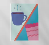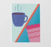 Un'illustrazione semplice ma accattivante di una tazza di caffè caldo e di una deliziosa fetta di torta.