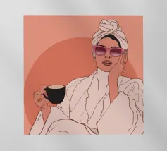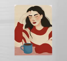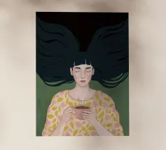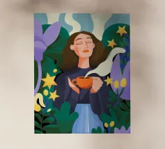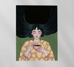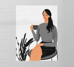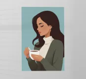 Una donna che tiene in mano una tazza di caffè caldo nella morbida luce del mattino. I toni delicati e le linee semplici ne fanno un'opera perfetta per le mattine lente e le routine tranquille.