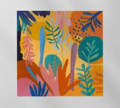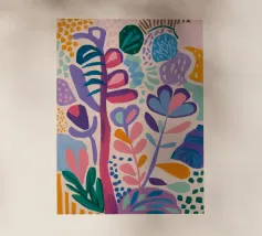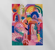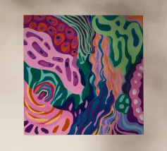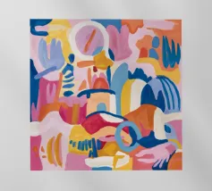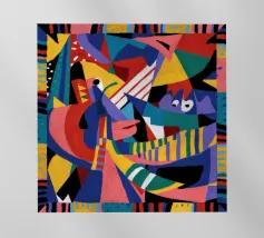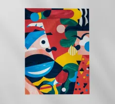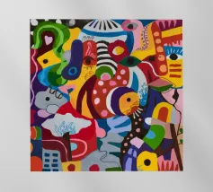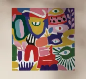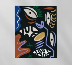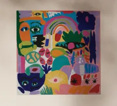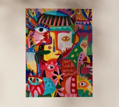 Colori audaci e contrastanti e forme astratte interconnesse caratterizzano quest'opera d'arte di grande impatto visivo. Occhi e forme organiche sono sottilmente inseriti all'interno del vibrante arazzo, suggerendo una narrazione giocosa e misteriosa attraverso il suo design geometrico ma fluido.