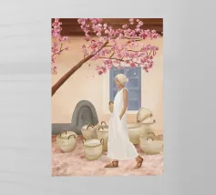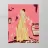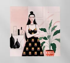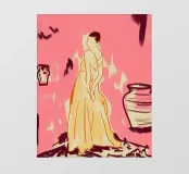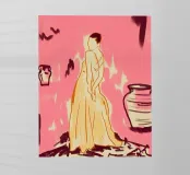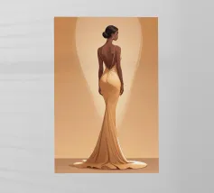 Una donna di spalle, vestita con un fluente abito dorato. Lo sfondo rosa tenue risplende di calore, circondato da semplici forme di ceramica. Questo pezzo cattura un momento tranquillo e riflessivo in un ambiente da sogno.