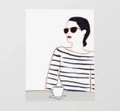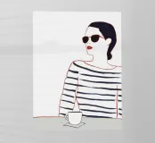 Illustrazione minimalista di una persona che indossa una camicia a righe e tiene in mano una tazza di caffè. Lo stile è pulito e moderno, con un'attenzione particolare alle linee semplici e al momento del caffè.