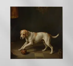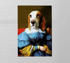Cane in piedi con le zampe su un tavolo in un ambiente classico pellicola backlit