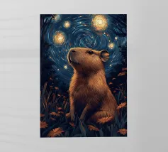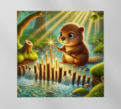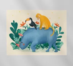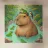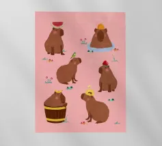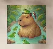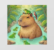 A capybara relaxed in a hot spring, surrounded by little birds perched on its head and frogs hopping on its legs.