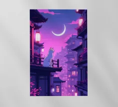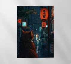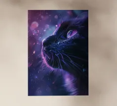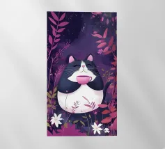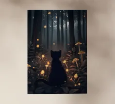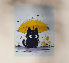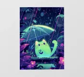 cat umbrella rain plants leaves flowers raindrops neon-glow forest night-sky puddle wet-surface purple-flowers glowing-light cute-animal cartoonish nighttime rainy-weather greenery dark-atmosphere