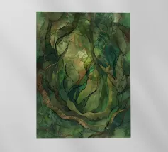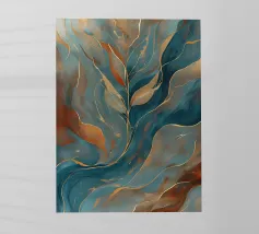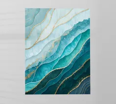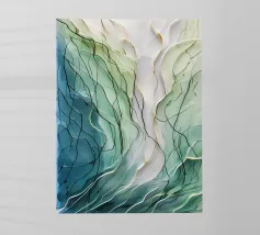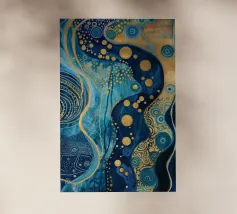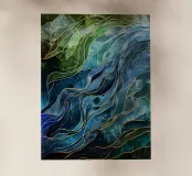 A mesmerizing abstract artwork featuring swirling, vibrant hues of blue, green, and gold. The intricate lines and patterns evoke a sense of cosmic depth and ethereal beauty. This piece is perfect for adding a touch of elegance and sophistication to any space.