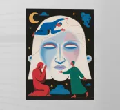 Questa opera d'arte mostra due figure, una rossa e una verde, che danzano sotto un arco con lune e stelle. Lo sfondo è blu scuro e rende l'atmosfera celestiale e mistica della scena.