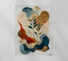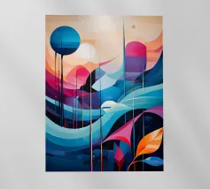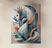 Un'accattivante opera d'arte astratta che fonde elementi organici e geometrici. Il fogliame rigoglioso si intreccia con corpi celesti e forme architettoniche, creando un senso di armonia ed equilibrio. La tavolozza di colori tenui e i dettagli intricati invitano alla contemplazione e all'esplorazione.